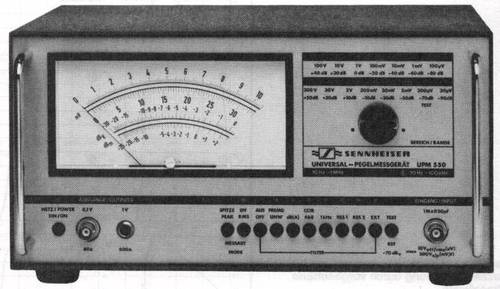 Das volltransistorisierte Universal-Pegelmeßgerät UPM 550 ist für Wechselspannungsmessungen im Bereich von 10 Hz bis 1 MHz ausgelegt. Es besitzt eine sehr hohe Empfindlichkeit von 30uV für Vollausschlag im Bereich bis 100 kHz. Die 15 sich überlappenden Meßbereiche können mit einem leicht bedienbaren Drehschalter ausgewählt werden. Die Eingänge sind gegen Überlastung gesichert. Ein Geräuschspannungsfilter nach CCIR 468-1, ein 1000Hz-Filter für selektive Messungen sowie das A-Geräuschbewertungsfilter und das Fremdspannungsfilter für Messungen nach DIN 45500, Blatt 4, sind fest eingebaut.