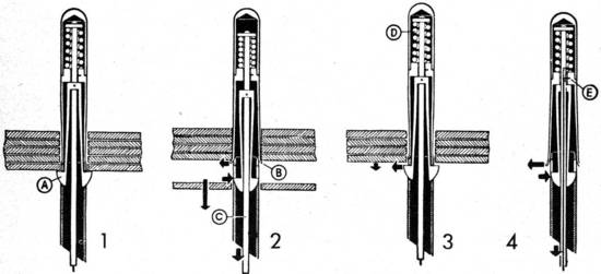 Das Teilbild 2 veranschaulicht das Arbeiten der Stapelachse im Augenblick des Abwerfens der ersten Schallplatte: Die Zugstange C im Innern der Achse bewegt sich nach unten und bewirkt dadurch zweierlei. Sie drückt nämlich die Spreizfedern B auseinander, die jetzt alle Platten mit Ausnahme der zuunterst liegenden festhalten. Weil gleichzeitig die Auflagenasen der Spreizfedern A in das Innere der Achse zurückweichen, fällt die unterste Platte auf den Plattenteller herab.