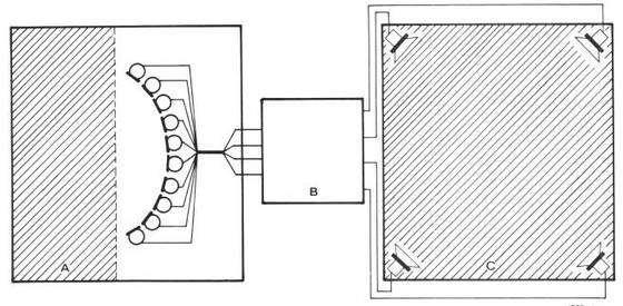 Das Ende dieser Kette bildet "Block C" als Wohnraum, in dem meistens in den vier Ecken die Lautsprecher stehen. Die verschiedenen Systeme in Block B können nun miteinander verglichen werden, indem der in Raum C wiedergegebene Schalleindruck in Beziehung gesetzt wird zu dem ursprünglichen Schalleindruck, der (vom Aufnahme-techniker) aus dem Schallgeschehen in "Block A" abgeleitet wurde. Zunächst sollen die grundlegenden Arbeitsweisen der verschiedenen Systeme kurz erläutert werden.