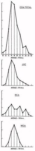 Fig. 3 shows the spreads in the playing time per side of disc of the three systems. The discs are from my own collection which ranges from heavy classics to rock. The total number of discs examined were SQ 36, CD-4 59 and QS 21 and it is most interesting to find that all of my commercially available discs including those from the UK, Japan or the USA in any system average out to about 19 1/2 minutes per side.