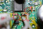 In der Nähe des Lochs, in das Pin 2 eingesteckt wird, muss eine Leiterbahn durchtrennt werden. Die Trennungsstelle ist mit zwei roten Strichen markiert (siehe mittleres Bild). Am Besten benutzen Sie dazu einen scharfes Teppichmesser. --- Vorsicht ist geboten, damit aus Versehen keine weiteren Leitungen durchtrennt werden.
