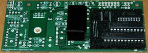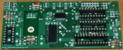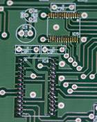 - Der obere 20 Pin Sockel ist für den HCT244, der darunter für den MUX-GAL16V8. In den unteren Sockel (24 Pin) wird der CLOCK-GAL 22V10 gesteckt. Achten Sie auf die Punkte auf den ICs. Sie zeigen die Position des Pin 1. Die Punkte müssen bei allen drei ICs in der unteren linken Ecke sein! Wenn Sie die ICs falsch einbauen werden sie zerstört!!