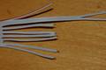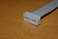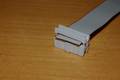 Zum Konfektionieren des Flachbandkabels benötigen Sie einen kleinen Schraubstock, eine Schere und ein scharfes Messer. Fädeln Sie das Kabel zunächst in den Stecker ein. Überprüfen Sie ob die rote Markierung des Kabels über der Markierung vom PIN 1 des Steckers liegt. Legen Sie den Stecker mit dem Kabel in den Schraubstock und drehen Sie zu. Kürzen Sie jetzt mit der Schere die Leitungen auf die im Foto gezeigten Längen. Zum Schluss isolieren Sie die Enden der Leitungen vorsichtig mit dem Messer ab.