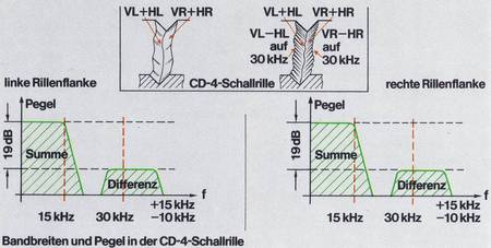 Die CD-4 Technik setzte einen Abtaster mit einer realen Bandbreite von über 40 Kilohertz voraus. Dazu wurden die beiden Frontkanäle beim Schnitt der Schallplatte bereits auf jeweils 15 kHz begrenzt. In den technischen CD-4-Manuals wird das ganz deutlich dargestellt. Für die beiden Rück-Kanäle blieb da nicht mehr viel an Bandbreite übrig.