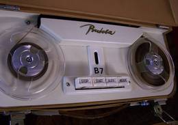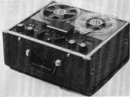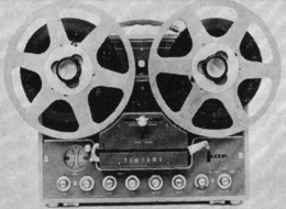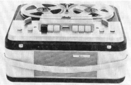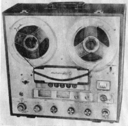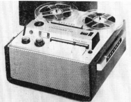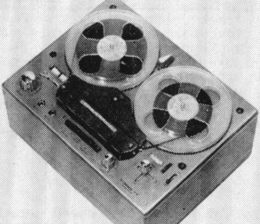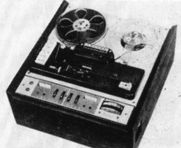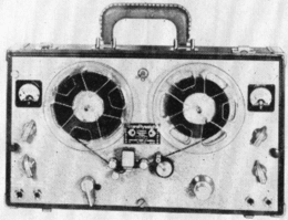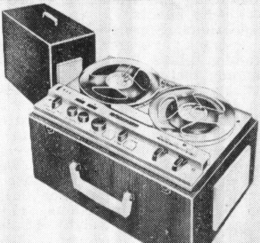 • MT-7. Portable transistorized 2-speed 2-track mono design, product of West Germany. Record-level indicator, operates from four flashlight batteries, accessories available for other power sources ; complete with dynamic microphone and carrying handle ; full line of accessories available.