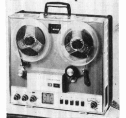 Specifications: Speeds-3%, 7% ips; heads -(3) % -track ; records 2-track stereo, 2-track mono; plays 2 and 4-track stereo, 2-track mono ; reel size S1^ in. ; 3 motors ; timing accuracy 99.8% ; freq. resp.-7% ips, ± 2 db from 40 to 15,000 cps ; 3% ips, ± 3 db from 50 to 10,000 cps ; signal-to-noise ratio, 52 db; wow and flutter, 0.15% at IV2 ips, 0.2% at 3% ips; rewind time, 1200-ft. reel, 45 sees. Inputs-microphone, impedance 1 meg, sensitivity 2 mv; high level, impedance 0.5 meg, sensitivity 0.35 volts; amplifier outputs-Impedance 5k ohms. Dimensions, 17%" wide, 9%" high, 18" deep; weight 48 lbs.