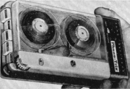 Specifications: Speeds 1% ips; heads- 2 %-track, records 2-track mono ; plays 2-track mono ; reel size 2% in. ; 1 motor ; freq. resp. 1% ips, ± 3 db from 100 to 6000 cps ; rewind time, 600-ft. reel, 30.1 sees. Inputs-microphone, impedance 200 ohms ; amplifier outputs-1 ; speaker outputs 1, impedance Ik ohms; output power 10 mw. Dimensions, 1%" wide, 4i/o" high, 1W deep ; weight, 2% lbs.