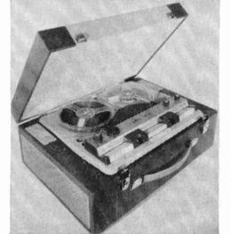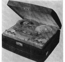 Specifications: Speeds - 3.75, 1% ips ; heads - 2 half track ; records 2-track mono ; plays 2-track mono ; reel size 3 in. ; 1 motor ; timing accuracy 0.05% freq. resp.-3% ips, ±3 db from 100 to 12,000 cps ; signal-to-noise ratio, 50 db ; wow and flutter, 0.5% at 3% ips. Inputs-2 microphone, impedance 200 ohms; amplifier outputs-1, impedance 200 ohms ; speaker outputs 1, impedance 4 ohms ; output power 2 watts. Dimensions, 12" wide. 3" high, 8" deep ; weight, 7 lbs. Other features : 4x6 speaker, ball-bearing motor, transistor-speed control.