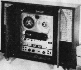 Specifications: Speeds - 15, 7, 3 Ips ; heads - 4 x 1/4-track; records 4-track stereo, 4-track mono ; plays 4-track stereo, 4-track mono ; reel size 7 in. ; 3 motors ; timing accuracy 99.9% freq. resp.-7y2 ips, +2 db from 35 to 18,000 cps ; 3% ips, ± 2 db from 35 to 13,000 cps ; signal-to-noise ratio. 50 db ; wow and flutter, 0.12% at 7% ips, 0.16% at 3% ips ; rewind time, 1200-ft. reel, 20 sees. Inputs -2 microphone, high impedance, sensitivity 1 mv ; 2 high level, impedance 600 ohms, sensitivity 0.25 volts ; amplifier outputs-4, phone plug, impedance 600 ohms ; speaker outputs 2, impedance 8 ohms ; output power 40 watts. Dimensions, 17" wide, 17%" high, 71,4" deep ; weight, 75 lbs. Other features: self-contained wide-range co-ax speakers ; front panel oilers ; variable speed fast forward and rewind ; 600-ohm balanced output.