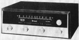 Specifications: FM: 9 tubes + 9 diodes; grounded-grid front end; 3 i.f. stages; bal. ratio detector ; 2 audio stages ; bar tube tuning indicator; output signal 1 volt; 2 outputs ; controls-tuning ; switches-FM or AM, a.f.c, stereo-mono, power; freq. resp. ± 0.5 db from 20 to 20,000 cps; signal-to-noise ratio 60 db ; capture ratio 5 db ; selectivity 300 kc ; IHF usable sensitivity 4 iliv ; AM suppression 50 db; harmonic distortion (100% mod.) 0.5%; stereo separation 35 db; switching stereo circuit; tube a.f.c. circuit; drift 10 kc ; dimensions: 13" wide, 4" high, 11" deep. AM: superhet circuit; 2-gang tuning capacitor ; diode detector ; 1 i.f. stage ; bar tube tuning indicator ; IHF usable sensitivity 10 uv ; freq. resp. ± 3 db from 20 to 6500 cps ; harm, dist. 1.0%.