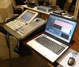 Als Mischpult benutzen wir den digitalen Grass-Valley INDIGO Video- und Ton- Mischer, der uns das (fast grenzenlose) Einstellen der Mikrofon- "Vor-Pegel" erlaubt.