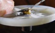 Eine der Kontaktflächen, bei uns diese goldene Halbkugel, taucht in diese Krümel ein und wird von den (auf die angeklebte Membrane auftreffenden) Schallwellen mehr oder weniger fest ein- bzw. angedrückt.