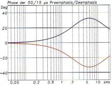 Bei der Wiedergabe wird die Anhebung durch das komplementäre De-Emphasis (rot) wieder rückgängig gemacht, und zwar sowohl amplituden- als auch phasenmäßig. Heraus kommt wieder ein linealglatter Frequenzgang.