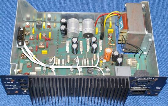 Mit etwas Geschick und einem auseichend festen Karton unten vor der Rückseite der Box konnte man diese Endstufen-Einheit fast gänzlich aus dem Gehäuse auf diesen Karton ziehen - die Steckverbinder blieben gesteckt - und man konnte die Box damit immer noch betreiben bzw. die drei Verstärker prüfen. Daß die 220 Volt Leitungen und Leiterbahnen (immer noch) in keiner Weise abgedeckt oder gegen unabsichtliche Berührung geschützt waren, schien damals niemanden zu stören.