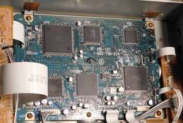 Beginnen wir zuerst mit dem SONY NS900. Hier haben wir eine ältere (aus 2001) noch recht umfangreiche Chip-Technik vor uns. Es sind mehr als 6 große Chips, die dort zusammen arbeiten. Das Netzteil des SONY ist dazu noch (recht aufwendig hinter dem Schnittbandkern-Trafo) in Analog- und Digitalteil separiert.