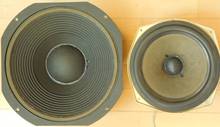 Selbst der Laie sieht an den unterschiedlichen Dimensionen, - also ohne die beiden Chassis bereits angehoben zu haben, daß das 36cm JBL Chassis in einer ganz anderen Liga spielt. Selbst die großen Grundig Boxen, in den 2 dieser Bass-Chassis werkeln, produzieren nicht diese gewaltige Klangfülle von einem LE14H-1 Chassis.