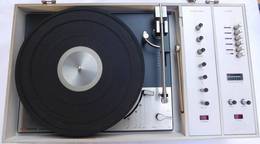 Diese Rank-Arena Phonokombination mit dem Lenco B55 Plattenspieler und den fummligen Tasten ist uns durch Zufall - kurz vor der Entsorgung - zugelaufen. Zu den damaligen Zeiten hatte der englische Rank- (Film-) Konzern alles aufgekauft, das an Firmen irgendwie zu haben war, so auch die Dänen von ARENA.