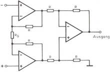 Da die Gleichtaktsignale am positiven und negativen Eingang mit gleicher Spannung und gleicher Phasenlage auftreten, werden sie durch die Differenzbildung der Eingangsschaltung unterdrückt. Beide Eingänge weisen die gleiche Impedanz auf und lassen sich wegen der hochohmigen Eingangswiderstände sehr leicht gegen Überlastung schützen.